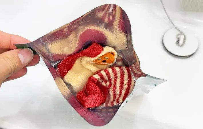筆者は、汗で汚れた靴下を入れてみました。袋の中で軽く揉み洗いをしてから、そのまましばらく置いておきます。
