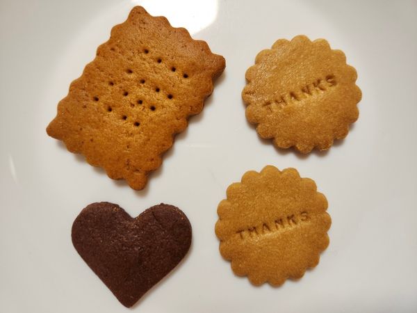 写真右上から時計回りに「Thanks クッキー(プレーン味)」が2つ、「ビターカカオ」(ハートのクッキー)、「かぼちゃ」のクッキー