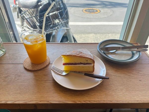 自家製ヴィクトリアスポンジケーキとオレンジジュースを注文。