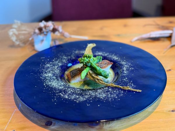 これもおもしろい食材の組み立てです。それぞれの風味が強い食材の集まりなので淡白な魚が埋もれてしまうのではないかと思いましたが、とんでもない!皮がとてもクリスピーで、身がふわっとしていて、複雑な旨味のソースを絡めながら食べるとそのおいしさが倍にも数十倍にもなります。シェフの天才的な技巧が光ります。