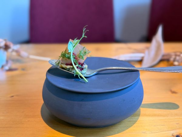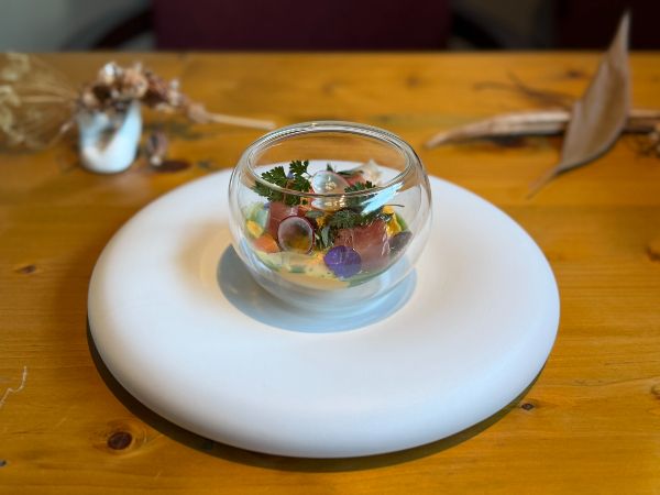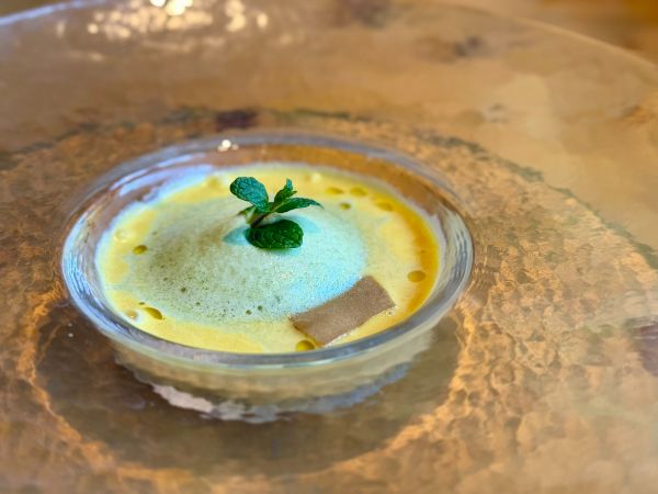 真空調理した有機人参とオレンジを使ったぷるぷるのムースにいろいろな食材がトッピングされています。黒七味の辛味がアクセントでお料理を引き締めています。スプーンを入れるところによって味わいが変わるのも◎
