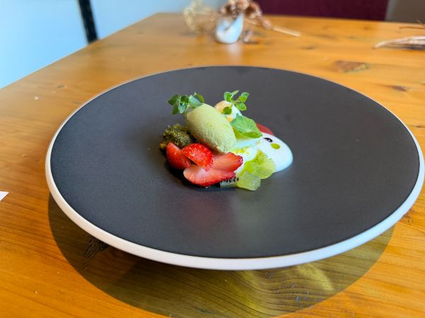 デザートに春の七草とはまた驚きます。思ったような青臭い草の感じがなく奥行きのある極上のスイーツに仕上がっています。ほんのり甘くて重すぎずコースの〆にふさわしい幸せに終われるスイーツです。
