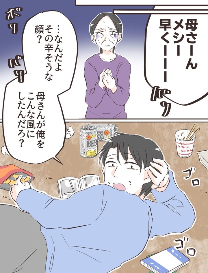 離婚して実家に帰ってきたカズキ。しかし、家事をするわけでもなく、生活費を入れるわけでもなく、ただ怠惰に過ごすだけ。母はカズキを戸惑ったような表情で見つめます。カズキはそんな母を見て「なんだよ、その辛そうな顔?母さんが俺をこんな風にしたんだろ?」と言いました。