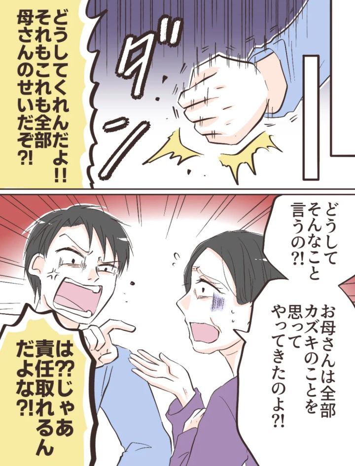 「どうしてくれんだよ!それもこれも全部母さんのせいだぞ!」カズキは離婚に至った原因をすべて母のせいにしました。突然責められた母は慌てて「どうしてそんなこと言うの!?お母さんは全部カズキのことを思ってやってきたのよ!?」と必死に反論します。しかしカズキは「は?じゃあ責任取れるんだよな!?」と聞く耳を持ちません。