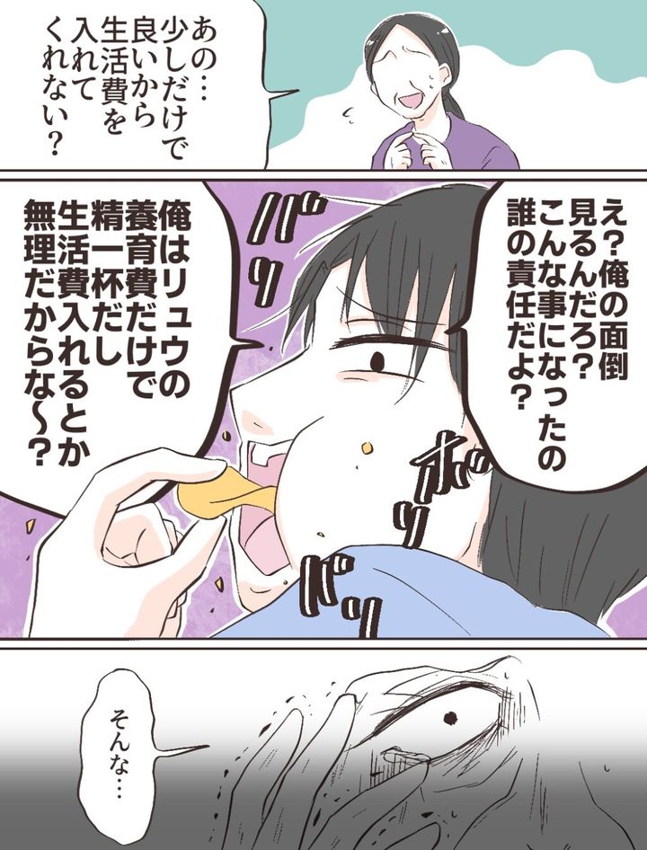 「あの、少しだけで良いから生活費を入れてくれない?」恐る恐るカズキにお願いするも、「俺の面倒見るんだろ?こんなことになったの誰の責任だよ?俺はリュウの養育費だけで精一杯だし生活費入れるとか無理だからな~?」と開き直ります。母はそんなカズキを見て、「そんな・・・」と頭を抱えました。