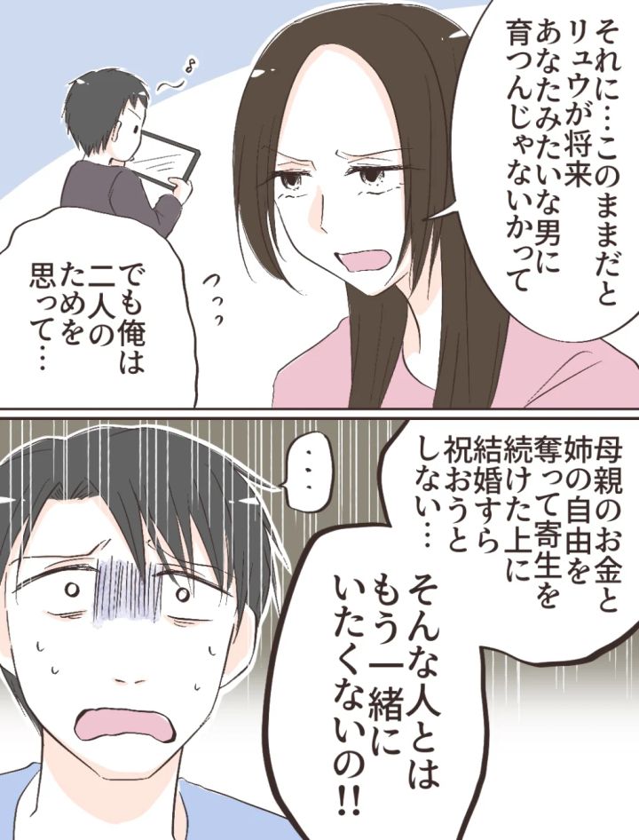 このままだと自分の息子がカズキのように育つかもしれないと思うと怖くなったと話す弟嫁。しかしカズキは、妻と息子のためを思っての行動だったのに、なぜそこまで否定されるのか理解できていない様子でした。「母親のお金と姉の自由を奪って寄生を続けた上に結婚すら祝おうとしない。そんな人とはもう一緒にいたくない」そうキッパリと言われてしまいます。