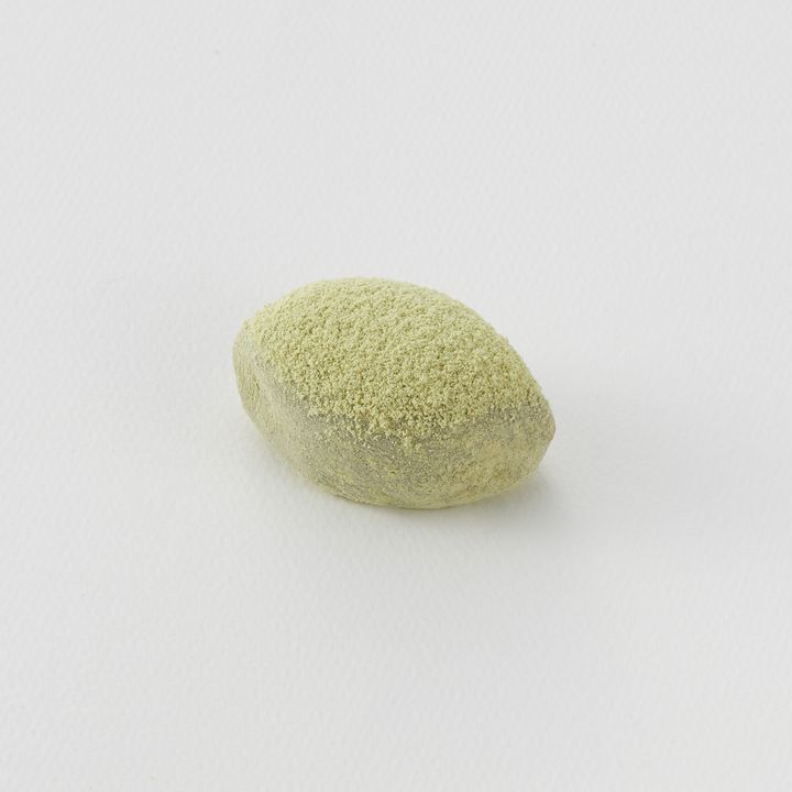 古くから伝わる鶯餅は、まさに小鳥のウグイスを模したお菓子。求肥で御膳餡をくるりと包み、両端をつまんで形を作っています。青い黄な粉をふわふわとまぶし、ウグイスの美しい緑色を表現しています。