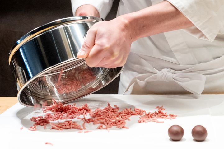 鮮やかに染まった白餡を裏ごししてそぼろにし、御膳餡(こし餡)に手作業で少しずつ付けていきます。