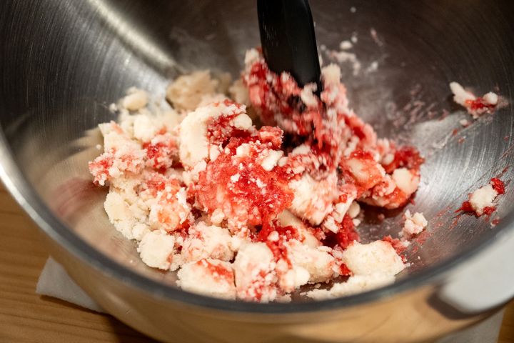 あまおうは、セミドライ、煮詰めたピュレ、生を刻んだものの3種類を用意。香りも味も楽しめるようにとバランスよく配合し、白餡に混ぜ込みます。酸味を補うため、レモン汁も少し。