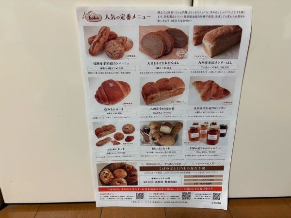 定番メニューには ・福岡産全粒粉カンパーニュ(4個入1550円) ・大豆まるごとおからぱん(6個入1950円) ・グルテンフリー九州産米粉オンリーぱん(三山分ロープ2本入2050円) ・塩れもんろーる(6個入1950円) ・九州産全粒粉山食(三山2本入1950円) ・九州産全粒粉クロワッサン(6個入2110円) ・おためしセット(6個(山)入2000円) ・朝ごはんセット(ぱん5個+70ccジャム1本2000円) ・季節の贈りものジャムセット(150cc4本入2600円) 他にもいろいろ!