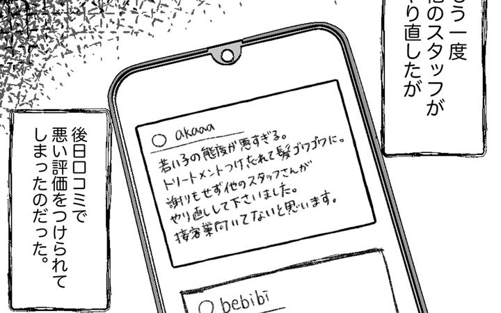 スゥさんが確認すると、明らかな染め残しがありました。お客さんに謝罪すると、あなたは悪くないと前置きしたうえで「まずは謝罪が先じゃない?」とえいこの対応に苦言を呈されてしまいます。