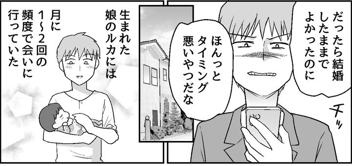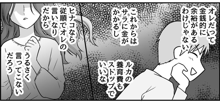 ユリの妊娠がわかり、オレは再婚。サラが生まれた。近頃のルカは会いに行くたび人見知りして、ヒナコの陰に隠れるようにして懐きもしない。サラを育てていくにもお金がかかるし、ルカの金銭的な面倒まで見てやる必要はないだろう。