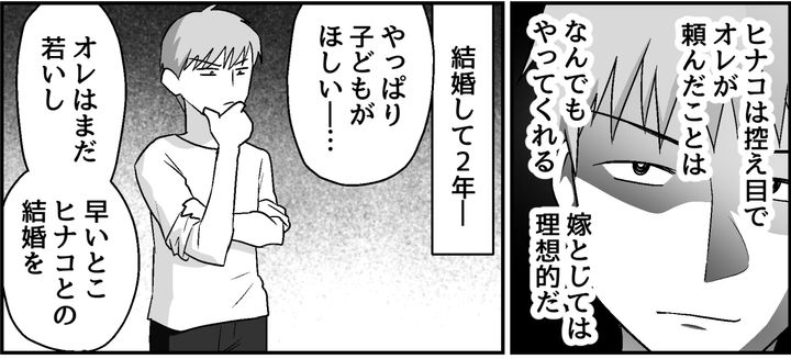 オレはゴウ。仕事関係で知り合ったヒナコは7歳年上だった。ヒナコは控え目でなんでもオレに合わせてくれる。オレが頼んだことは嫌な顔せずやってくれる。いつだってオレのやりたいことを自由にさせてくれる。嫁としては理想的だ。しかしもうじき40歳になるヒナコは結婚を躊躇していた。年齢を理由に子どもを持てないかもしれないと言うのだ。だからオレは「子どもはいなくてもいい、ヒナコと一緒にいられればそれで幸せなんだ」と説き伏せた。