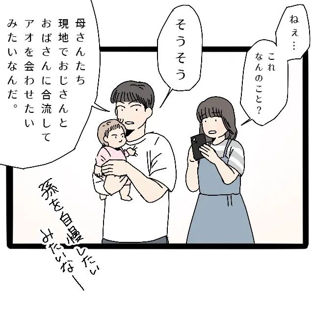 さっそくコウタに聞いてみると、当然のように「そうそう」とうなずいたコウタから、温泉旅行に行って、現地でさらにおじさん、おばさんとも合流したがっているという話をこの時初めて聞きました。義母が親戚にもアオを会わせたいと言っているようなのです。そんな話、私は何ひとつ聞いていません。