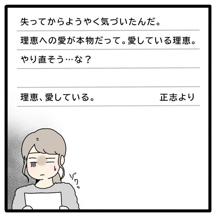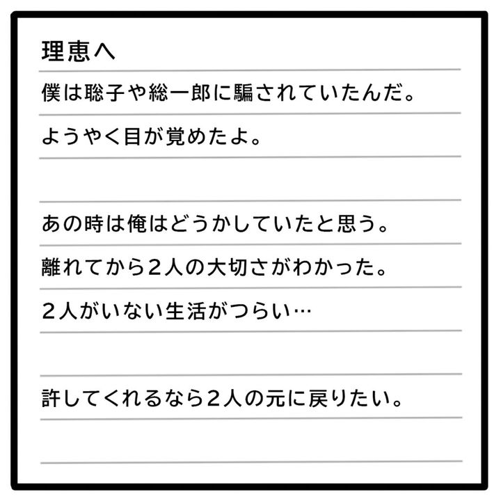 同窓会で地元に帰り、地主の息子総一郎さんの妹で初恋の相手でもある聡子さんが離婚して戻ってきたと知った正志さんは家族よりも彼女を優先するように。理恵さんは浮気を疑い、正志さんは否定するも、聡子さんを支えたいと離婚を切り出され、娘リマちゃんの親権と家、正志さんの退職金と預貯金を養育費として受け取ることを条件に離婚に同意、しばらく経った頃美沙さんから連絡を受け聡子さんと会うことに。聡子さんは、自分のせいで離婚させてしまったことを理恵さんに謝罪した後、学生時代に正志さんからストーカーまがいの行為を受けていたことを告白、そもそも夫とも離婚していないどころかやり直すつもりと聞き理恵さんはビックリ。その後、聡子さんは総一郎さんには夫に会いに行くと嘘をつき、夫の赴任先である海外へ。聡子さんと再婚する話も総一郎さんと事業を立ち上げる話もなくなり、たったひとり放り出された正志さんは、酔った勢いでかつて理恵さんたちと暮らした家に行き泣き喚いて警察沙汰に。心配する美沙さんの予想通り、実家にあらわれた正志さんは2人に会いたいと立ち尽くし、母親から当分こっちに来ない方がいいと言われた理恵さんは、泣きながら書いたという手紙を送ってもらうことにしました。