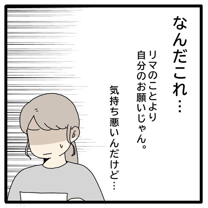 リマへの手紙を読んで、「なんだこれ・・リマのことより自分のお願いじゃん。気持ち悪いんだけど・・」と思った私。もう心の中には正志への愛情はこれっぽっちも残っていないことを痛感したのでした。