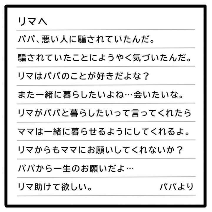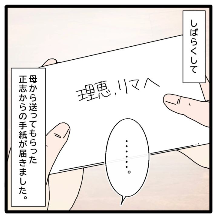 正志が実家に来たとお母さんの連絡で知り、「理恵たちが来るまで見張られてるかも」と言われてゾッとした私。お母さんにも当分実家には来ない方がいいと言われ、リマにも何かあってはいけないと思っていると、正志が泣きながら手紙を書いていったと聞き、何かのついでに手紙を送ってもらうことにしたのでした。
