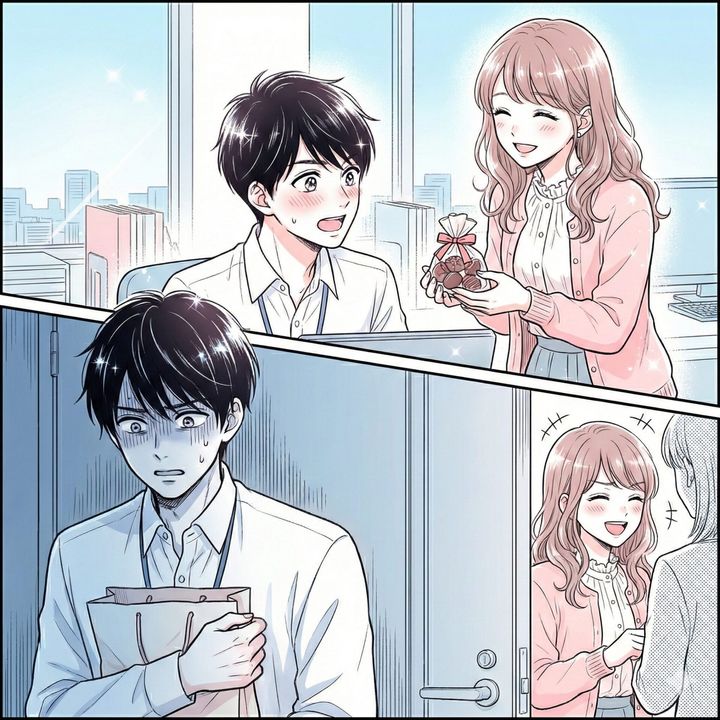 ホワイトデー当日、お返しを手に期待に胸を膨らませて休憩室へ向かうと、中から弾むような先輩の声が漏れ聞こえてきました。