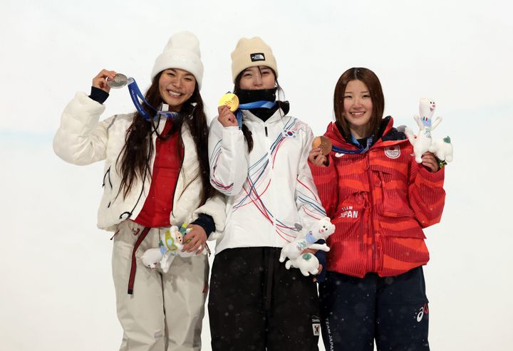写真左から:スノーボード女子ハーフパイプでメダルを獲得したクロエ・キム(アメリカ、銀)、チェ・ガオン(韓国、金)、小野光希(日本、銅)