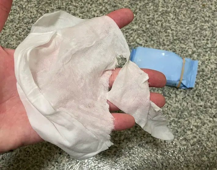 きつく縛ってしまうとウェットシートが取り出しにくく、このように破れてしまいました…。