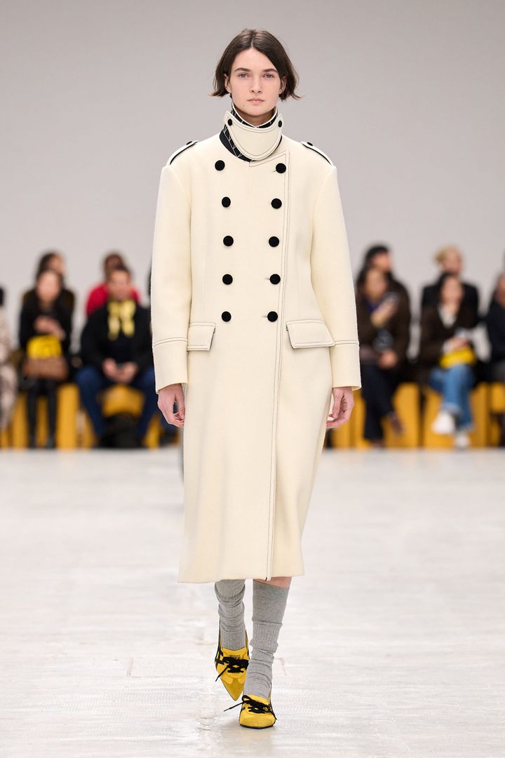 2026-27秋冬トレンドアウターの主役に躍り出たのが、クラシックな印象のダブルブレストコート。おすすめは、首元を覆い隠すハイネックやスタンドカラーデザイン。フロントのボタンを留めてかっちりと着こなせば、きちんと感のある知的な佇まいに。モードに仕上げるならロングブーツを、抜け感を演出するならソックス&パンプスを足元に選んで。