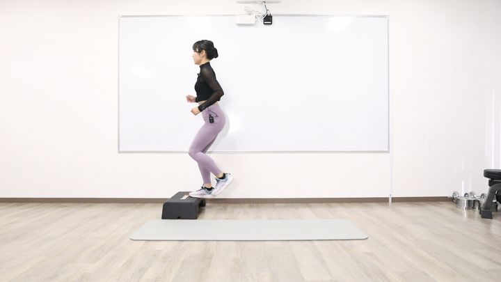 踏み台の上り下りを、スピードを上げて行います。バランスを崩さないようにしましょう。