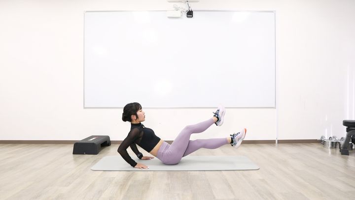 仰向けになり、かかとをくっつけて両足を浮かせます。その状態で脚の上げ下げを行いましょう。