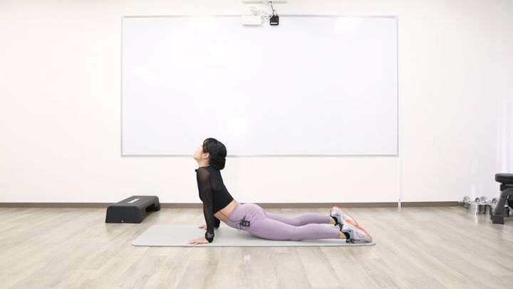 うつ伏せの状態で両腕を伸ばし、上体を押し上げます。呼吸は止めず、リラックスして行いましょう。