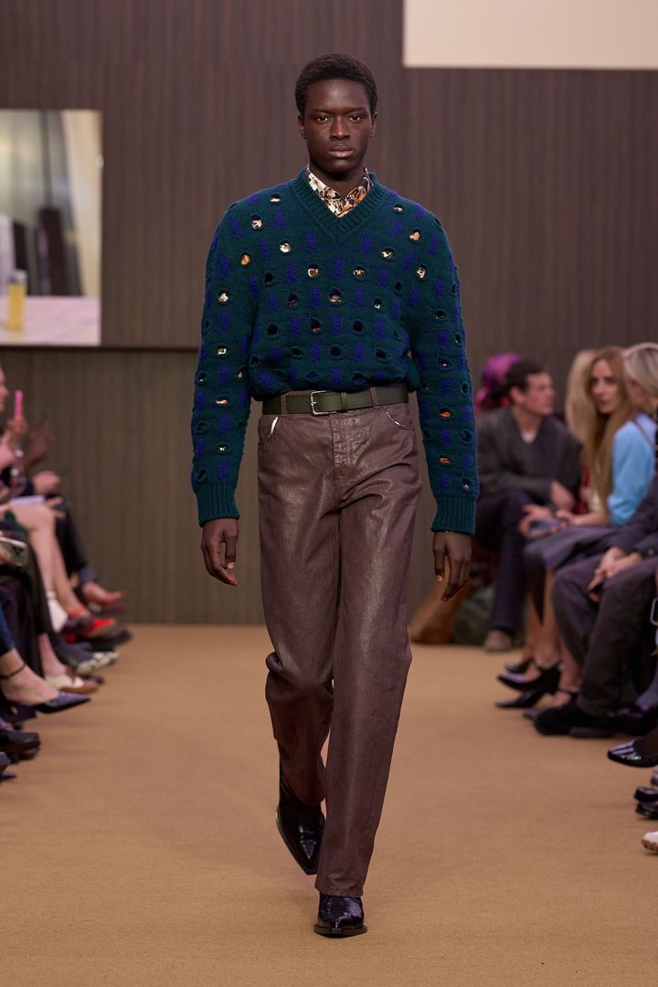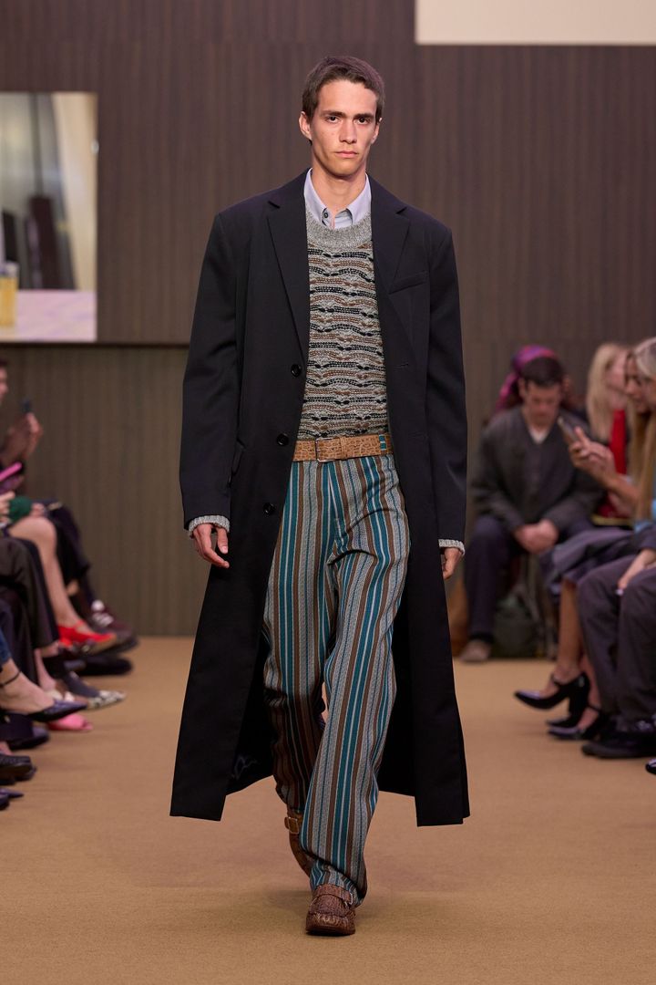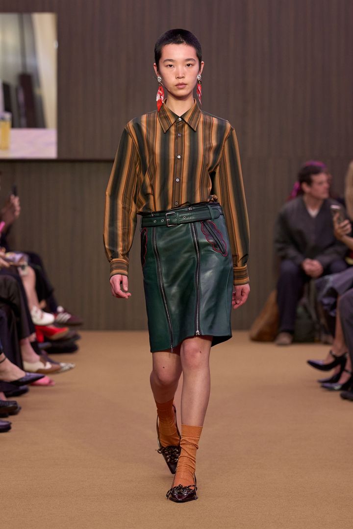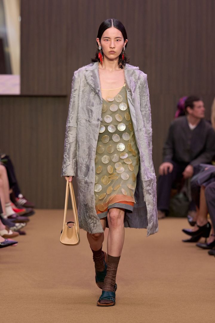 昔からマルニのシグネチャーであるファーテクスチャーは、シアリングやヤギの毛のコートとして再解釈。メゾンを象徴するプリントも再考された。ストライプ柄を前面に押し出したルックや、ドット柄のスカートにトップ。ドットはゆるく取り付けられた円盤として表現され、モデルが一歩進むごとにジャラジャラと音を立てながら揺れる。グラフィックなフローラル柄は変わらずシャープでモダニズム風で、そこには甘さも、軽やかさも、やわらかさもない。装飾は一貫してアーティスティックで、昔から人々を惹きつけてきたマルニの幻想的な一面を踏襲している。