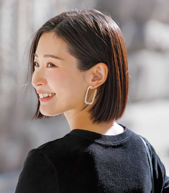 黒みがかったツヤのあるモードなショートボブ。スタイリングのお気に入りはgiovanniの「2chicモイスト ヘアセラム」だそう!