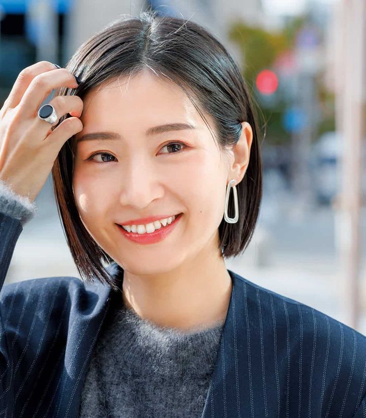 ボブヘアの魅力のひとつは、首元がもたつかないこと。前田さんのノーカラーのジャケットとモヘアニットの合わせも、すっきり映えます。