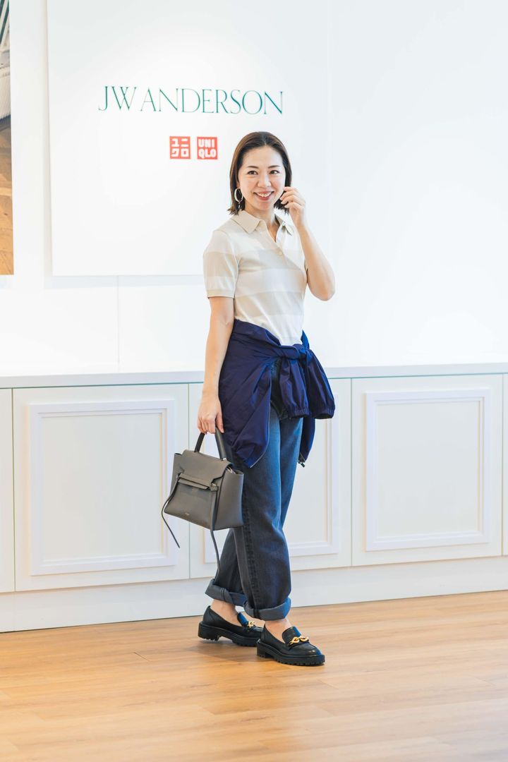まだまだ人気が続くラガーシャツ風の太めボーダー柄のポロセーター。控えめなコントラストのボーダーは40代にも挑戦しやすいこなれアイテム。甘いスカートとの相性も抜群だけど今回は黒のデニムと合わせて、カジュアルなマリンルックを意識しました。ズボンの裾をロールアップして抜け感を出し、こなれ感をプラス。気温差が激しい春先にサッと羽織れるアウターを腰巻し、気になる腰回りをカバーしました。