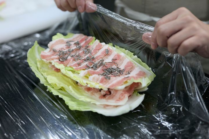 2.ラップを広げ、その上に1の白菜、豚バラ肉、塩昆布を重ねる。これを3回繰り返し、3層にする。