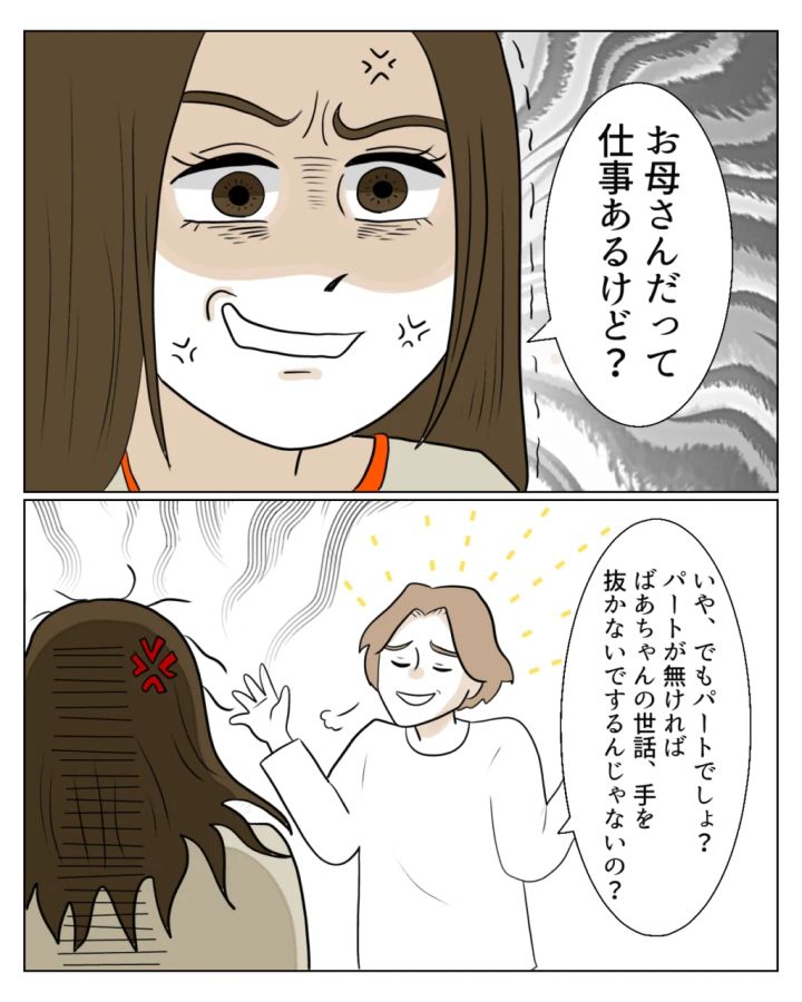 「お母さんだって仕事あるけど?」怒りに震えながらそう言い返す真矢。しかしタクマくんはまだ口出しをやめません。「でもパートでしょ?パートが無ければばあちゃんの世話、手を抜かないでするんじゃないの?」と上から目線で言ってきたのでした。