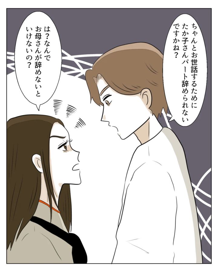 それだけでなく「ちゃんとお世話するために、たか子さんパート辞められないですかね?」と無理難題まで押し付けてきました。真矢は苛立ちを抑えきれず、「は?なんでお母さんが辞めないといけないの?」と言い返します。