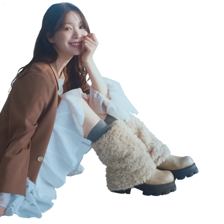 会った瞬間に目を引く、もこもこブーツが主役の旬バランスコーデ♡ やわらかな白ワンピにブラウンジャケットを重ねることで、甘さの中に大人っぽさをひとさじプラス。