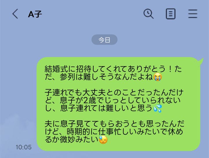 グループラインで私が「旦那の仕事が忙しくて行けるか分からない」と言うと「いつ予定分かる?招待状送っていい?子連れでも大丈夫!」と来たので個人ラインで「今息子じっとしてられないんだよね。子連れは難しくて。旦那も休めるか分からないからごめん」とラインしたら既読無視されました😂