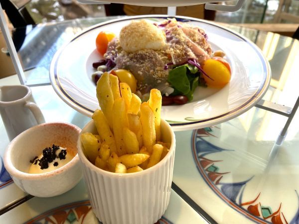 1段目は生ハムと温玉のサラダとトリュフマヨネーズ添えのポテト。サラダはシャキシャキ野菜に生ハムの塩味と温玉のまろやかさ。