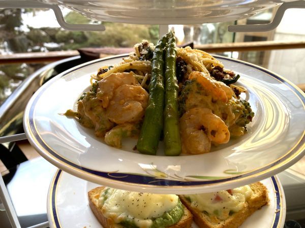 3段目は海老とブロッコリーの炒め物 アスパラガス添え、奥にはひき肉たっぷりのボロネーゼ。