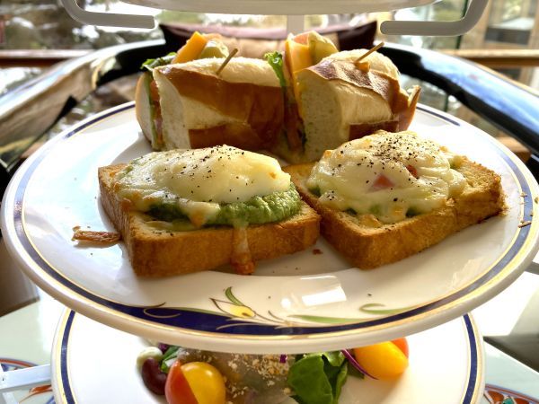 2段目はアボカドと明太子のトーストとベーグルサンド。トーストはアボカド明太に温玉とチーズがとろけて美味しい~。