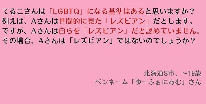 そして「ゆーふぉにあむ」さんの場合は、書き方としては 「世間」という、本人以外からの評価が「レズビアン」 なのであって、当のAさんはそうだと思っていないって状況なんだよね。