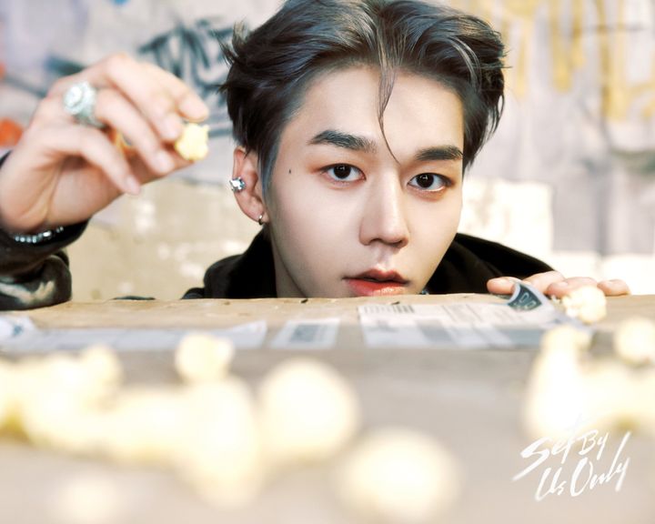 2022年に放送された日韓合作のサバイバルオーディション番組「THE ORIGIN -A, B, Or What?」に参加していたジェオンは、右目横にあるほくろがチャームポイント。凛々しい太眉に、アッシュグレーのヘアカラーによって、ワイルドかつ強さを感じさせるビジュアルに。