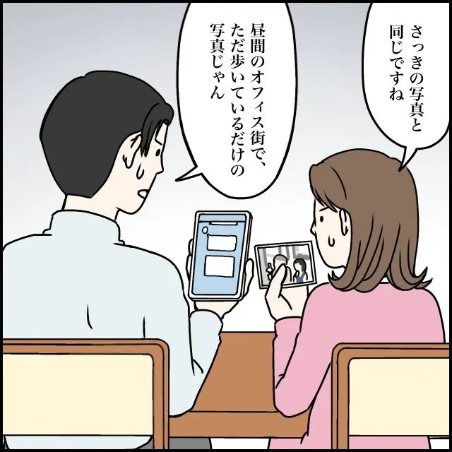 玲美さんから勇也さんに送られてきた画像は、勇也さんの会社に届いた手紙に同封されていた写真と全く同じものでした。スマホの画像と写真を見比べながら「さっきの写真と同じですね」と呟く私。そして、「昼間のオフィス街でただ歩いているだけの写真じゃん」と太一が言うように、その写真は2人が並んで歩いているだけで不倫の証拠といえるようなものではありませんでした。
