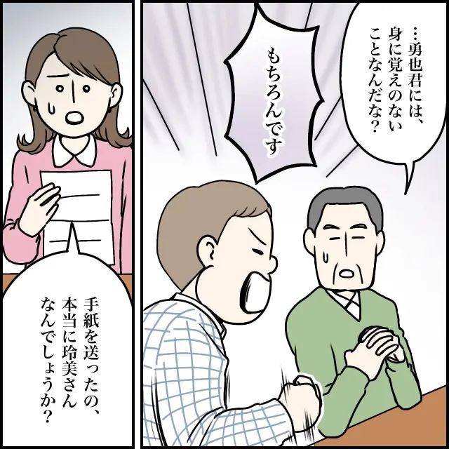「・・勇也君には、身に覚えのないことなんだな?」と義父に再確認され「もちろんです」と力強く言い切る勇也さん。「手紙を送ったの、本当に玲美さんなんでしょうか?」と私が聞くと、