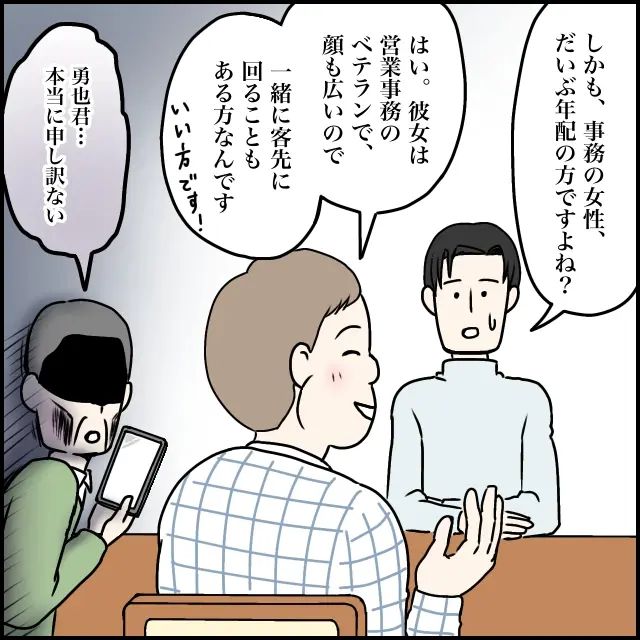 「しかも、事務の女性、だいぶ年配の方ですよね?」と言う太一に「はい。彼女は営業事務のベテランで、顔も広いので一緒に客先に回ることもある方なんです」と写真の女性のことを話してくれる勇也さん。その様子から、勇也さんの言っていることに嘘はないとはっきりわかります。私のときと同様、またしても玲美さんの勘違いだとわかった義父は「勇也君・・本当に申し訳ない」と力なく謝罪。自分の娘とはいえ、玲美さんのやっていることが理解に苦しむことばかりの義父は、この数分のうちにげっそりとしてしまったように見えます。