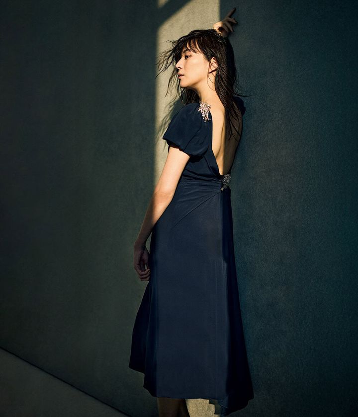バックコンシャスなネイビーのドレスには、ジュエリー代わりのブローチをON。華やかさをプラスして、より洗練されたムードに。ドレス¥159,500ブローチ上¥38,500下¥35,200(すべてヌメロ ヴェントゥーノ/イザ)
