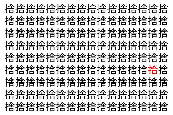 画像の中には、「捨」という漢字が縦に9行、横に16個並んでいます。 全部で144個となりますが・・・、そのうち1つは「異なる漢字」となってますよ!!