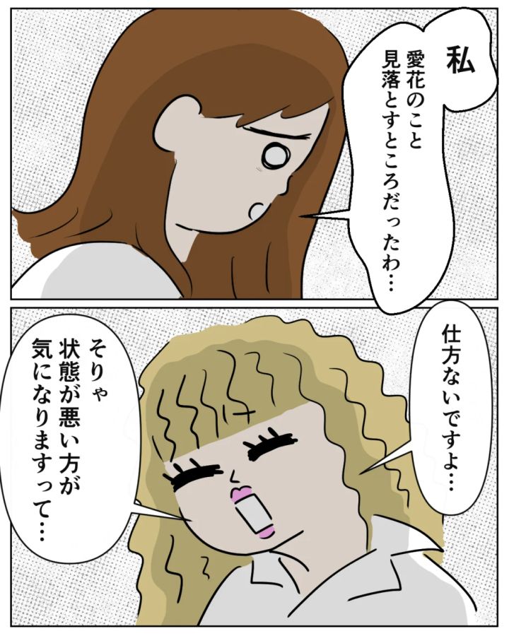 りえちゃんに言われていなければ、明るく振る舞っている愛花が傷ついていることに気づくのがもっと遅かったかもしれません。「仕方ないですよ。状況が悪い方が気になりますから。」その言葉に愛花のことを疎かにしていたと後悔が押し寄せます。