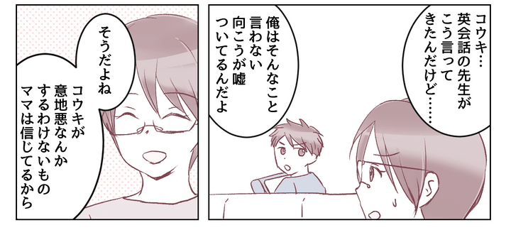英会話の先生から電話をもらったとき、私は何かの誤解だろうと思いました。うちのコウキが誰かに意地悪するなんてことはありえません。コウキだって「向こうが嘘をついている」と否定しています。親としてわが子の言うことを信じることにしたのです。