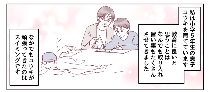 私はユリ。ひとり息子のコウキは小学5年生です。コウキにはいろいろな習い事をさせてきました。幼児期からの英会話はもちろん、音楽に触れさせたくてピアノやダンスも取り入れました。なかでも頑張っているのはスイミングで、現在は週5日泳ぐ選手コースに在籍しています。旦那が競泳経験者だからコウキには才能があるのでしょう。送迎や月謝は大変ですが、すべてコウキのため。最愛の息子の輝かしい未来のために、私も必死で頑張ってきました。
